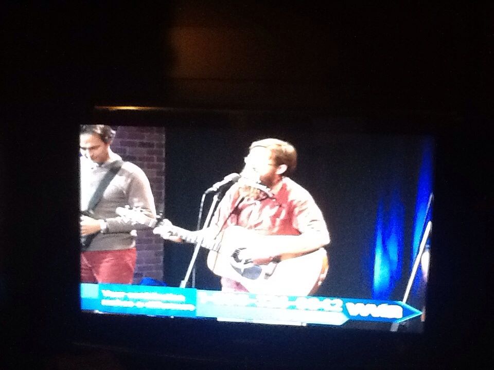 Playing for the telly was interesting. There are no monitors, no amplification, and so you’re singing into mikes, but you can’t tell what’s being picked up. Coming out of the first chorus, I launched into the next verse, only to realize I didn’t know what it was. What came out of my mouth was “Well…”, which IS how many of my verses start, but not this one. For what felt like a minute (on the tape, it is six seconds) I was totally lost at sea. Still playing the right chords, Randy and Safa still doing their parts, but absolutely clueless as to where I was in the song…”I’m cutting out one of the settlers verses…did I already play one of them? Have I done the next verse? I know I haven’t done the harmonica solo…”