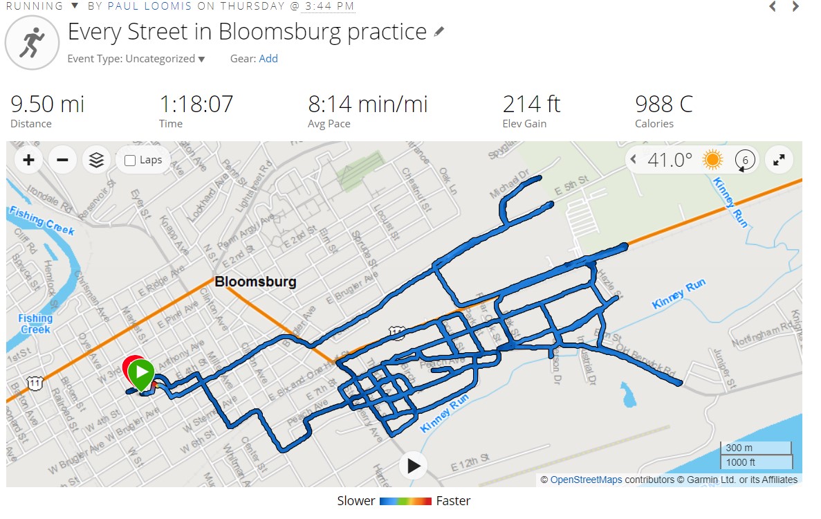 December 12, 2020: I’m going to try to run every single street in Bloomsburg, a route that will be about 70 miles long. Here’s the itinerary: